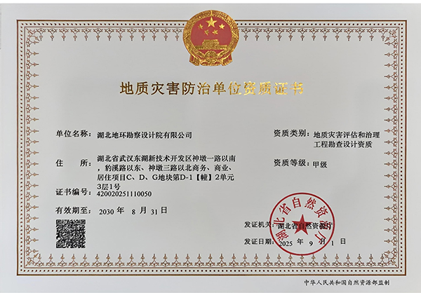 地质灾害评估和治理工程勘察设计资质证书(湖北地环勘察)