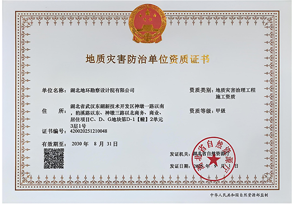 地质灾害治理工程施工资质证书(湖北地环勘察)